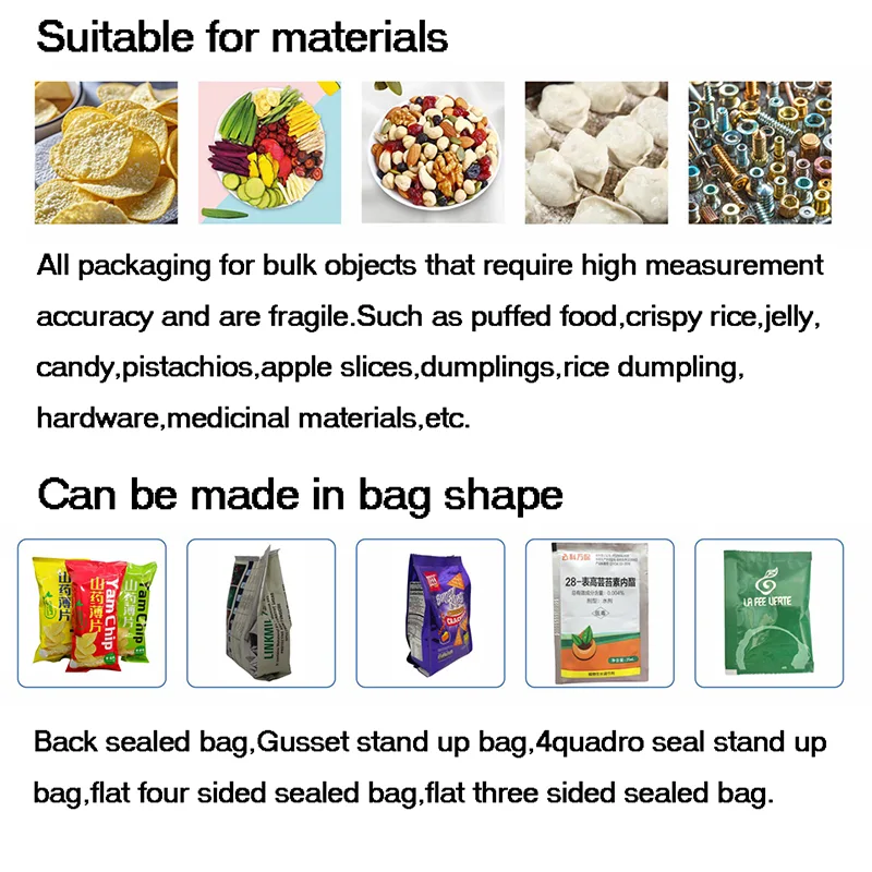 縦型包装機は、粉末、顆粒、スナック、穀物、ハードウェア部品、小型の工業用部品を包装できます。